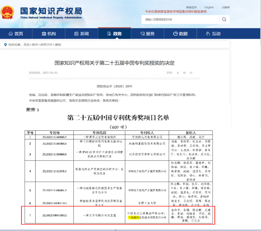 近日,國家知識產權局公布了第二十五屆中國專利獎授獎名單,三峽高科信息技術有限責任公司(以下簡稱 “三峽高科”)與中國三峽武漢科創園聯合申報的發明專利《一種文件傳輸方法及裝置》榮獲中國專利優秀獎,首獲國家級專利獎項,實現知識產權領域新突破。